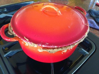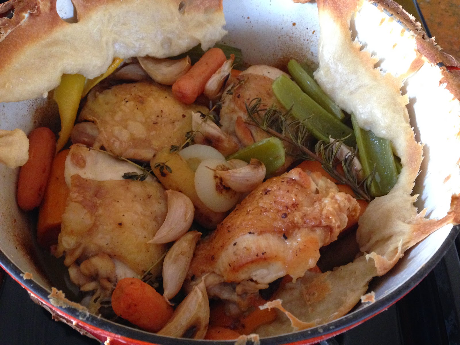 So mistake number 1. I used my dutch oven to brown my vegetables and chicken, I thought I would save on dishes. Then it occurred to me that the dough to seal the pot would melt against the hot pot. Thanks to my husband’s quick thinking he cooled the pot in water before we put the dough on.