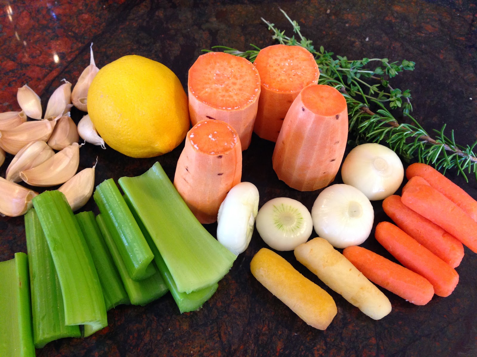 This chicken dinner includes preserved lemon (I substituted lemon rind), sweet potatoes, onions, carrots, celery, garlic, thyme, rosemary and chicken of course.