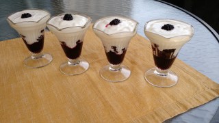 To macerate the berries you add seeds of half of a vanilla bean to 1/4 cup of sugar and blend with your fingers. Add two cups of blackberries and one cinnamon stick and let sit for 35 minutes to one hour. Divide the berries between 4 glasses and top the berry mixture with 2/3 cup of plain yogurt. I did not have 10 ounce jars as the recipe calls for so I had leftover macerated berries as it would not all fit. We enjoyed these on a hot summer day.