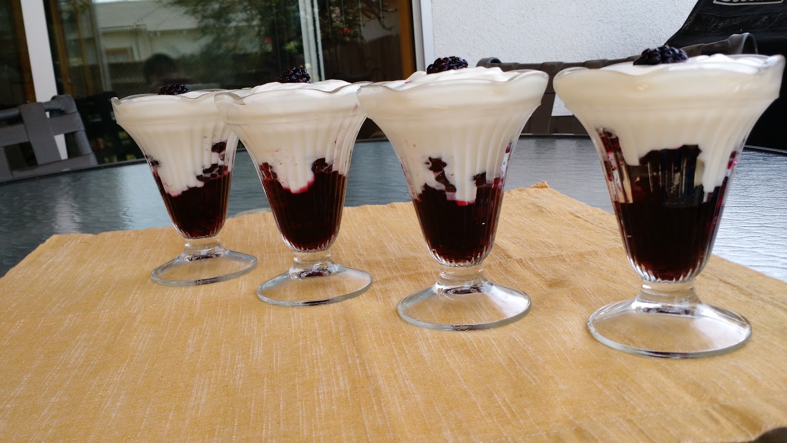 To macerate the berries you add seeds of half of a vanilla bean to 1/4 cup of sugar and blend with your fingers. Add two cups of blackberries and one cinnamon stick and let sit for 35 minutes to one hour. Divide the berries between 4 glasses and top the berry mixture with 2/3 cup of plain yogurt. I did not have 10 ounce jars as the recipe calls for so I had leftover macerated berries as it would not all fit. We enjoyed these on a hot summer day.