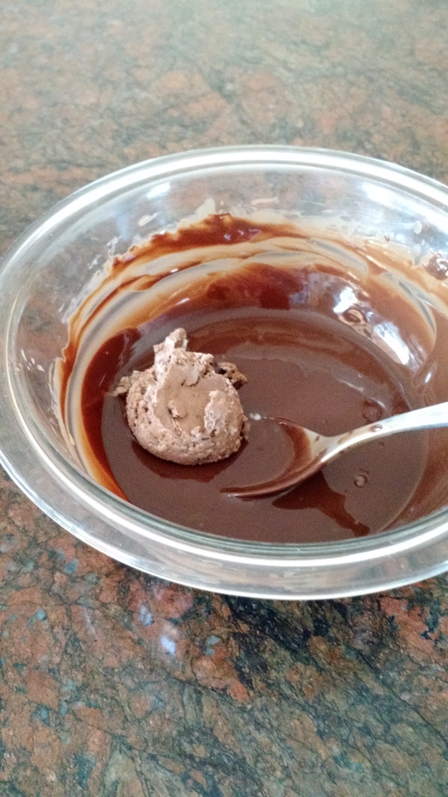 I put the frozen ice cream balls in the hard-crack chocolate sauce to coat.