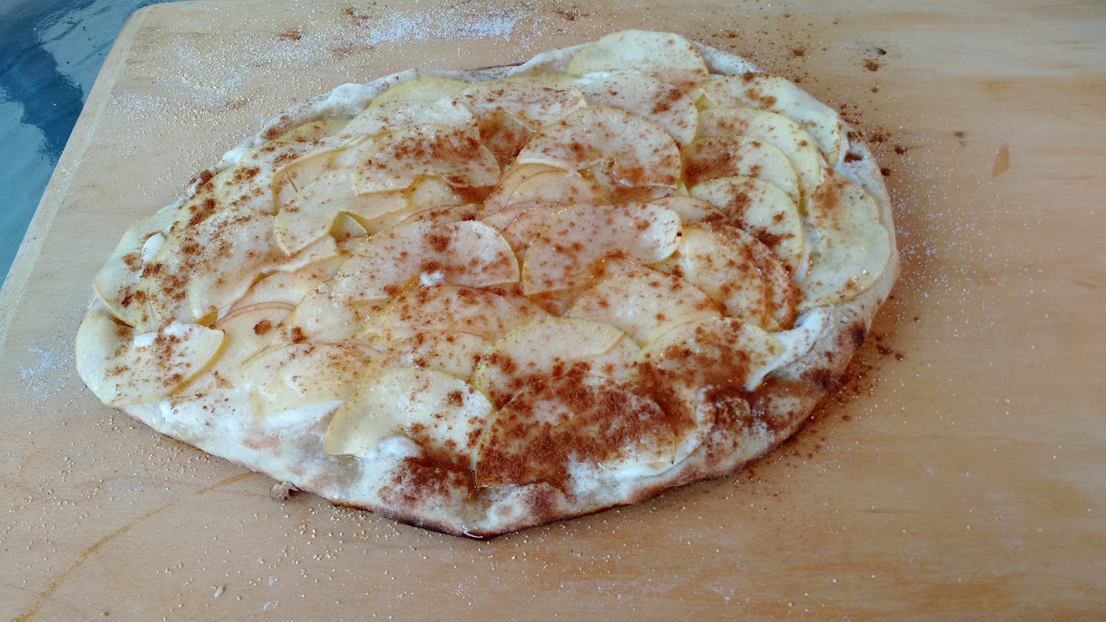 Tarte flambee is like a pizza built on a thin base of bread dough and topped with a mixture of cream cheese, plain Greek yogurt, heavy cream, sugar and sliced apples. When I read through the directions for this recipe, it had my husband’s name written all over it. We have a pizza stone and my husband is in charge of making pizza in our family.