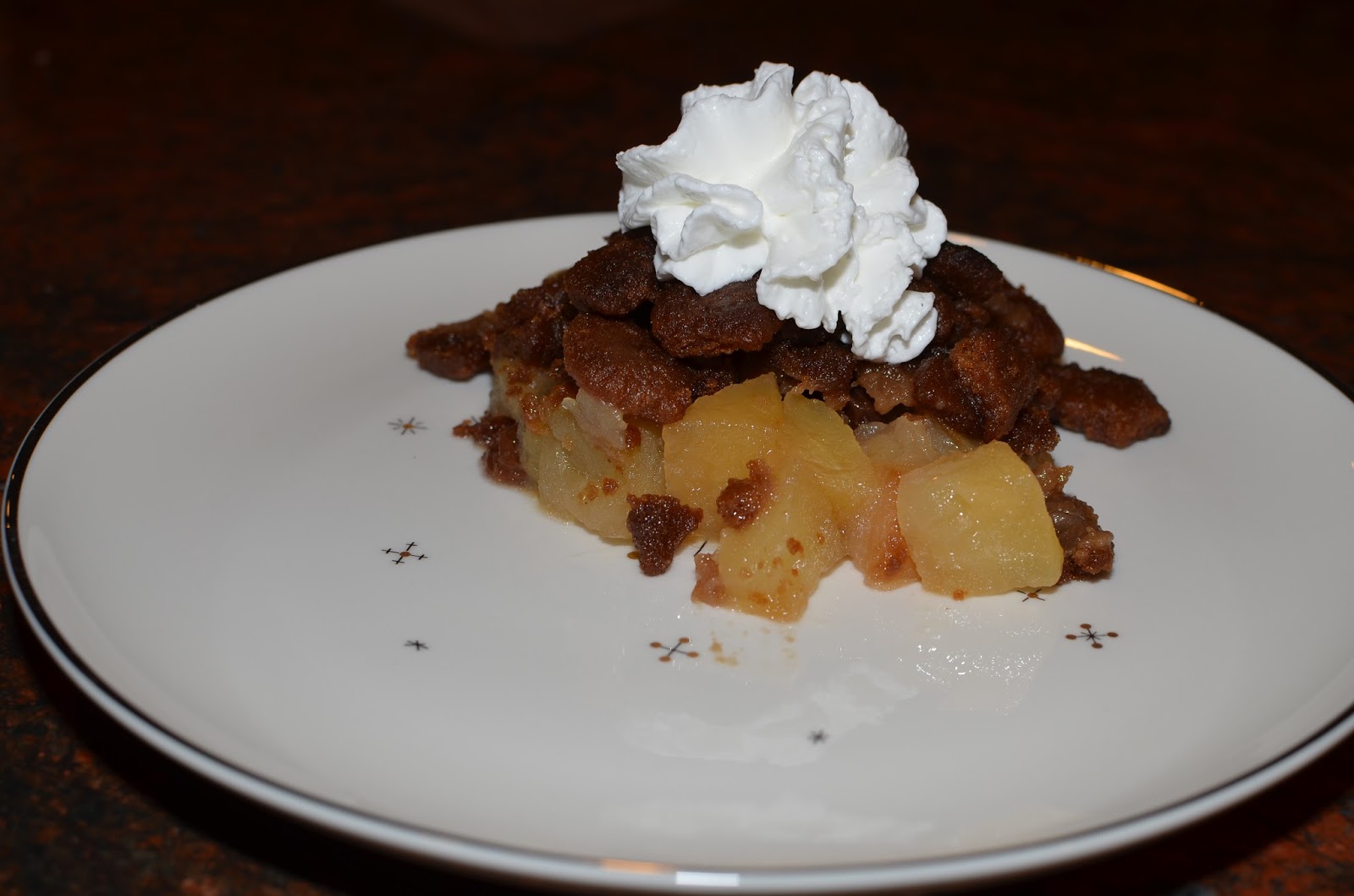 First I cut up four apples into chunks, added a tablespoon of sugar and 3 tablespoons of raisins. The messy part was breaking up all the speculoos cookies and mixing with half cup of butter. The dish is baked at 375 degrees for 30-40 minutes. I put foil on my after 20 minutes as the cookies started to burn.