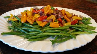 The green beans are blanched in salted boiling water for 4 minutes then immersed in ice water to stop the cooking. Half of a red onion, red bell pepper and yellow bell pepper are roasted in the oven 425 degrees with salt, pepper and olive oil for about 15 minutes. Final step the green beans are sauteed in a pan with olive oil to reheat and served with the roasted vegetables.