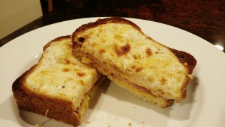 The recipe starts with a white sauce; butter, flour milk. Stir until thickened. Add salt, pepper, nutmeg, grated Gruyere (I used Swiss) and Parmesan. Bread is toasted, spread with mustard, ham, more Gruyere, topped with another slice of toast. The top is spread with the cheese sauce and another layer of Gruyere then broiled to perfection. We adjusted amounts to our tastes which I am sure was much less than the recipe.