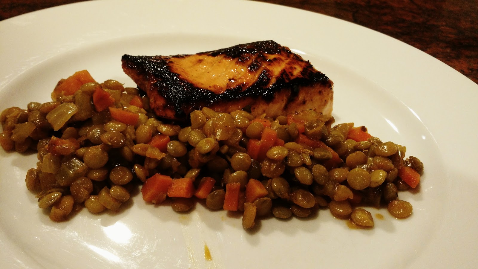 This week at I Heart Cooking Clubs we were challenged to make a dish Jeffery, Ina’s husband, would love. I don’t think I have seen a dish that Jeffery didn’t like so the choices were endless. My riff on this challenge was making my husband’s favorite dish, salmon with lentils.