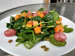 This is a great winter salad with butternut squash, grapes and pumpkin seeds. The flavor comes from roasting the butternut squash and roasting the grapes. The pumpkin seeds also get a toasting. The salad dressing is a mixture of olive oil, maple syrup, cider vinegar and Dijon mustard. A very tasty salad that I have been enjoying as a lunch or dinner meal. The recipe can be found on Ellie Krieger’s website.