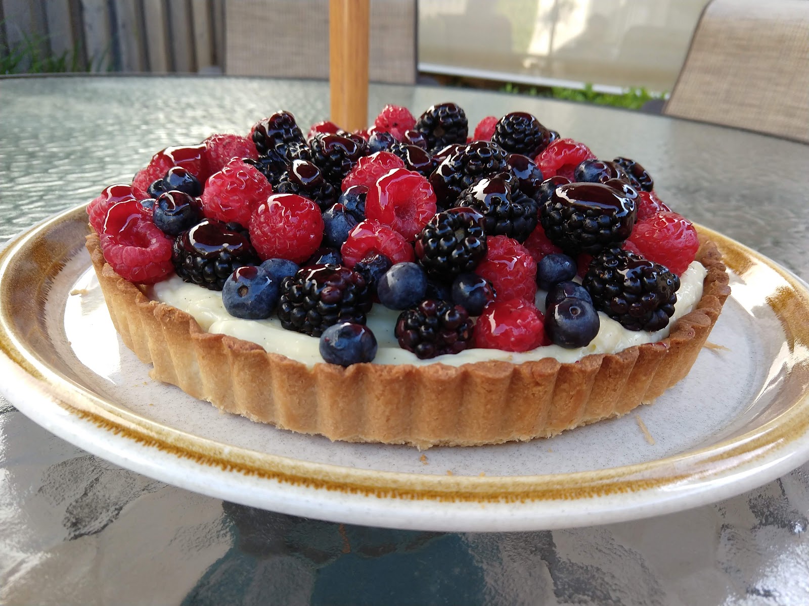 The perfect summer dessert, classic fruit tart. Made with Dorie’s flawless sweet tart dough, vanilla pastry cream and a bounty of summer berries. I glazed my berries with raspberry jam as that is what I had on hand. This was a delicious way to end a meal on a very hot summer day. To see what others thought head over to TWD.