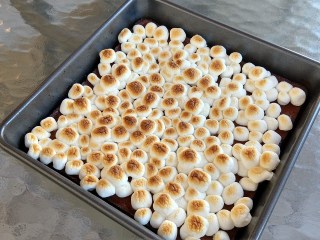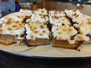 The base which is a little like Dorie’s sweet tart dough baked up easy. The filling, which seemed like a lot, spilled over the dough and I feared I had ruined my dessert but when it came out of the oven it looked fine. I had trouble getting my pie bars to set-up. I probably baked it over 15 minutes past Dorie’s suggestion of 30 minutes. The edges of my dessert look a little over baked but tasted fine. I went with Dorie’s suggestion of topping with marshmallows and I think that was a hit with my friendsgiving crowd. Not a crumb was left for this dessert. I can’t wait to make this one again and add it to my holiday menu.