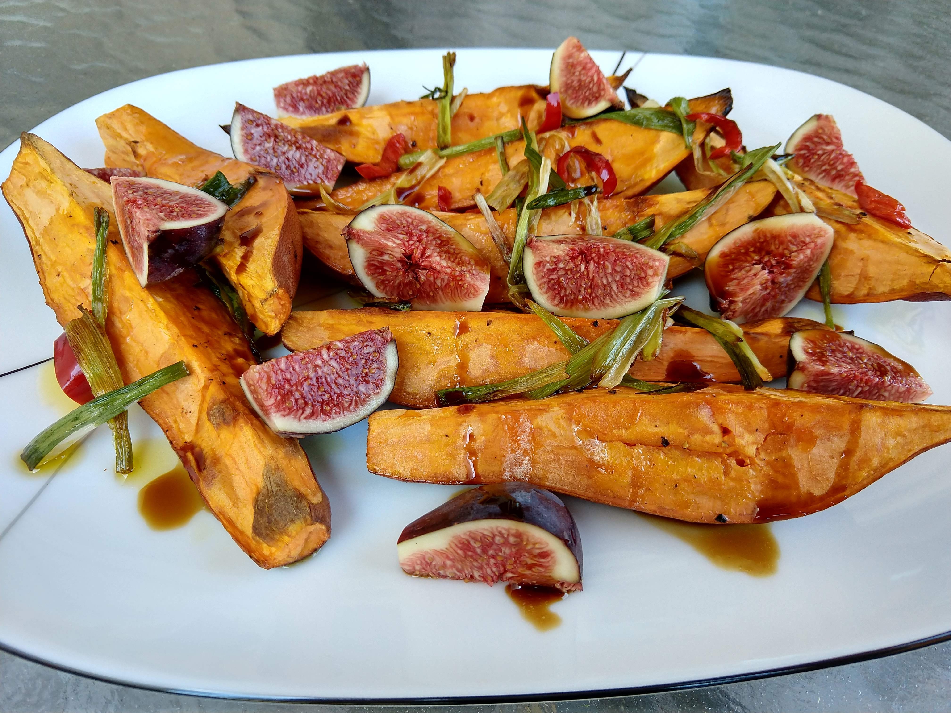 This week at I Heart Cooking Clubs the theme was procrastinator’s special. From the website: “We all have those recipes that we’ve been meaning to make, yet we keep putting them off. Which recipe have you been procrastinating? And why? Choose any recipe from any of our IHCC Chefs!” Last summer I was in Israel. I purchased spices to bring back and cook with, my spices are still in the original package, unopened. I promised my husband I was going to cook from Jerusalem A Cookbook with said spices. Here I am a year later and I have yet to keep my promise. Life just got in the way I guess, I don’t have a really good excuse why. Anyway, now that figs are in season where I live I remembered Shirley making this recipe. It was worth turning the oven on in the summer heat. Roast sweet potatoes in olive oil, salt and pepper. Make balsamic reduction. Fry green onions and red chile. Pour olive oil, green onions and red chile over the potatoes. Add fresh figs and goat cheese. Drizzle balsamic reduction over the top. This could have not been easier and delicious. I did not have goat cheese so I went the vegetarian route. This was delicious and a recommended recipe. To see what others made head over to IHCC.