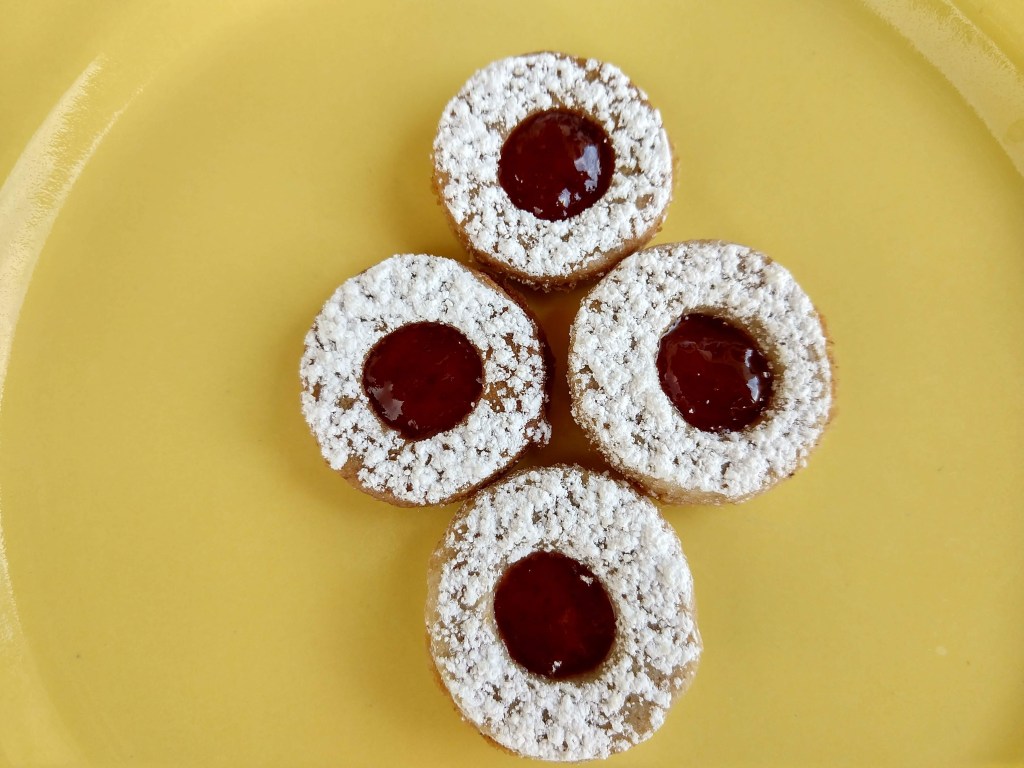 I voted for these jam filled sandwich cookies because my husband loves jam, I had jam to use up and I had all the ingredients to make them, a win-win-win. The German name for this cookie is Spitzbuben translated as little rascals. This is a new cookie for me. I made one substitution, my husband dislikes walnuts so I used pecans. I filled half of the cookies with strawberry jam, pictured above, and half with apricot jam. The recipe got thumbs up from my husband and father-in-law, the cookie monsters of the family. They are best the day they are made which is a little snap to them. By the next day they are soft which Dorie did mention. These cookies look good and taste great. Like any rolled cookie with cutouts they are a labor of love. To see what others thought head over to Tuesdays with Dorie.