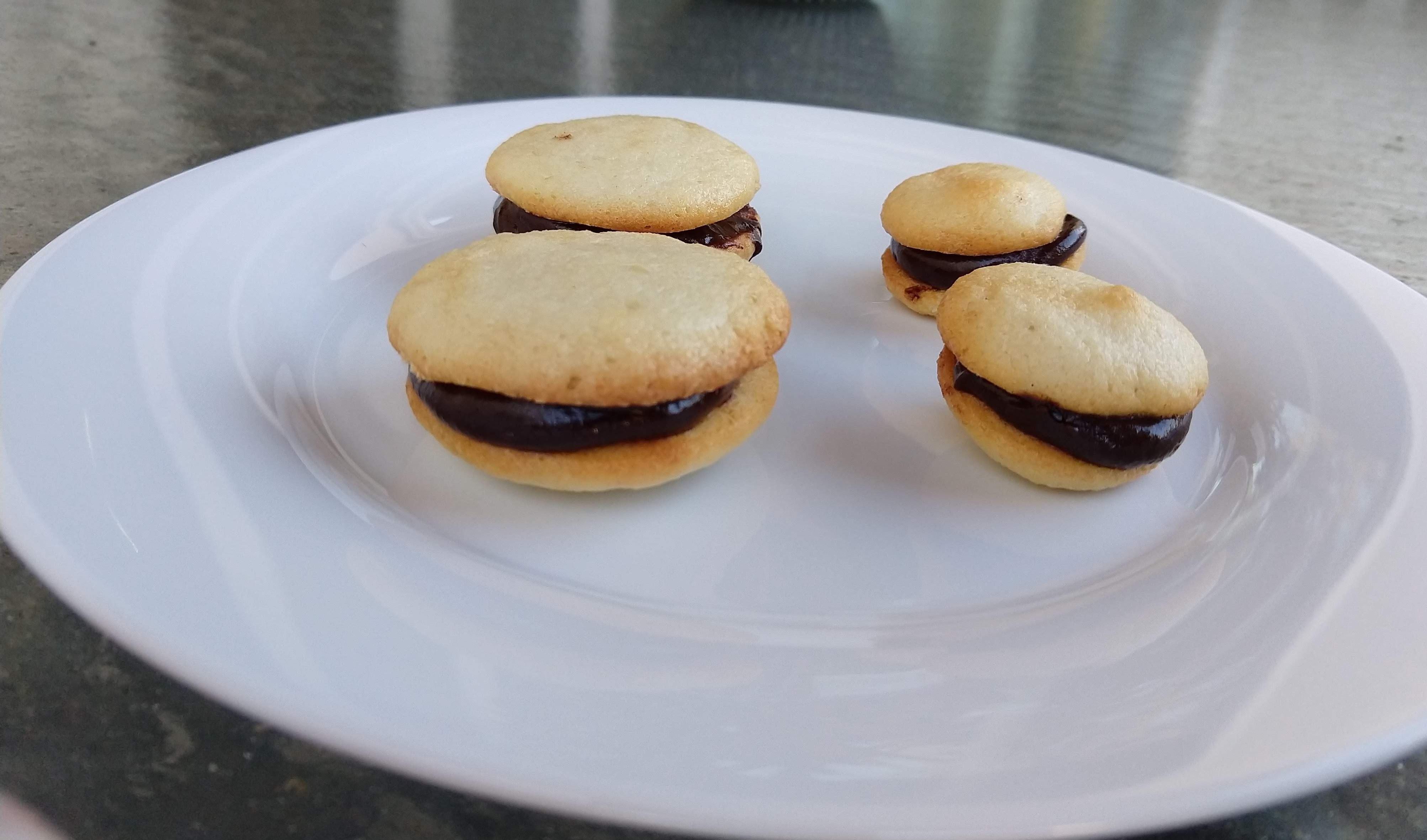 This week on Tuesdays with Dorie we are baking from Dorie’s Cookies. Biarritz cookies are a soft cookie made from almond flour, flour, confectioners’ sugar, butter, milk, egg whites that have been whipped up and sugar. The cookies are then pipped on to a tray. I followed Dorie’s instructions and made my first batch the size of a quarter but I thought they were too small. My second batch I made them much bigger which I liked better. The cookies can be eaten plain, topped with chocolate or sandwiched, I took the sandwich route. I thought the naked cookies tasted too plain. We enjoyed the sandwiched cookies especially the chocolate filling. Soft cookies are not my preference so I don’t think I will make them again. To see what others thought head over to Tuesdays with Dorie.