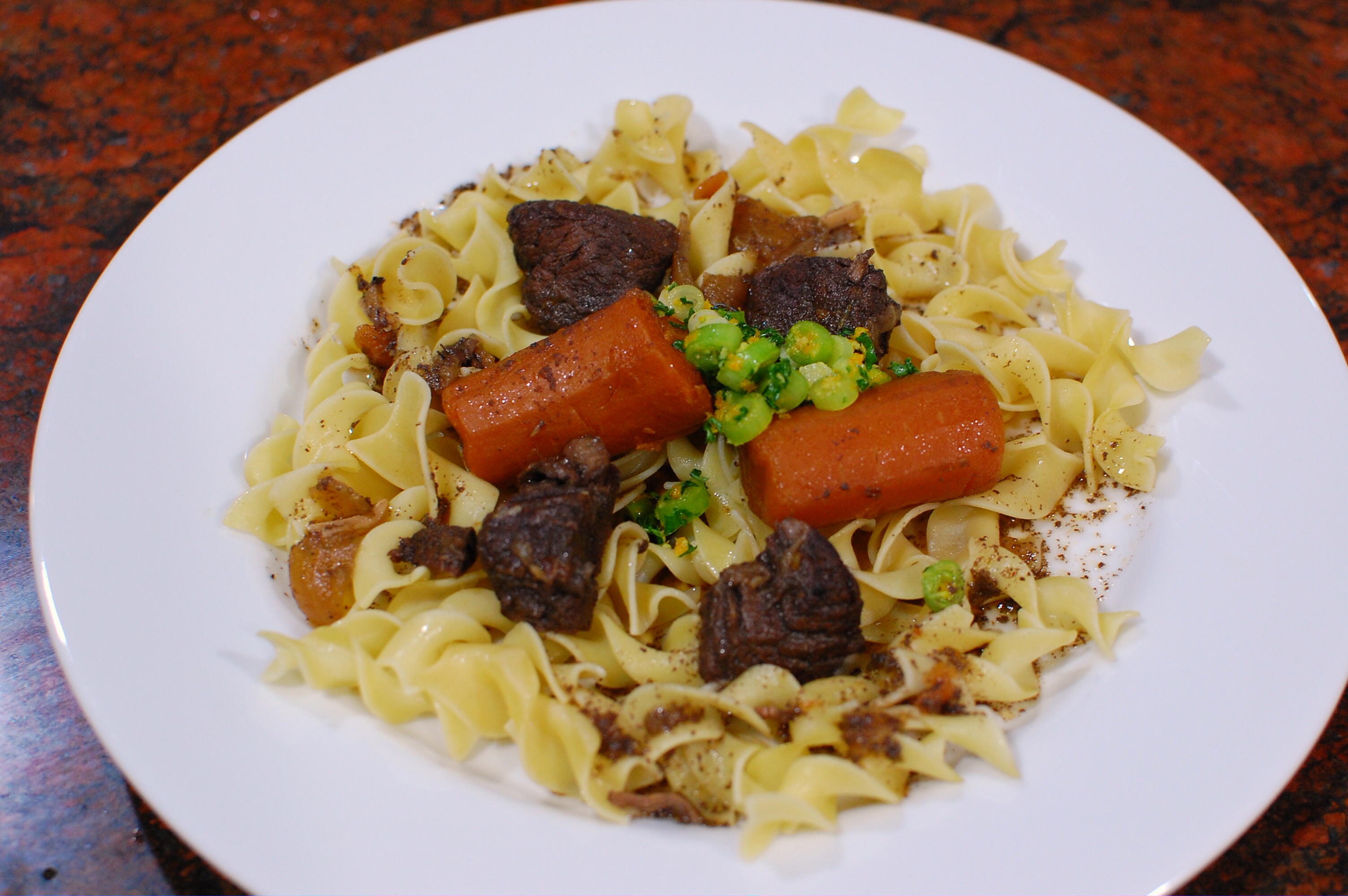 The timing of this beef stew was just right, it was cold and I had a red bottle of wine to use up. I made one substitution, I did not have any gochujang so I used red Thai chili paste instead and I forgot to buy cranberries. I planned ahead and read the directions well so I could marinate the beef overnight. I don’t usually cook beef unless it is with our cooking group, so I was looking forward to this treat. I was able to read a few comments in our group before cooking this dish. I followed suit and kept the vegetables even though they were overcooked. When I was ready to cook I went straight to the “to make the stew” section and totally forgot about putting the meat on paper towels first. My meat searing did not go so well. I made the dish mid-day so I would have time to freeze the fat before serving but I did not have much fat to scrape off.