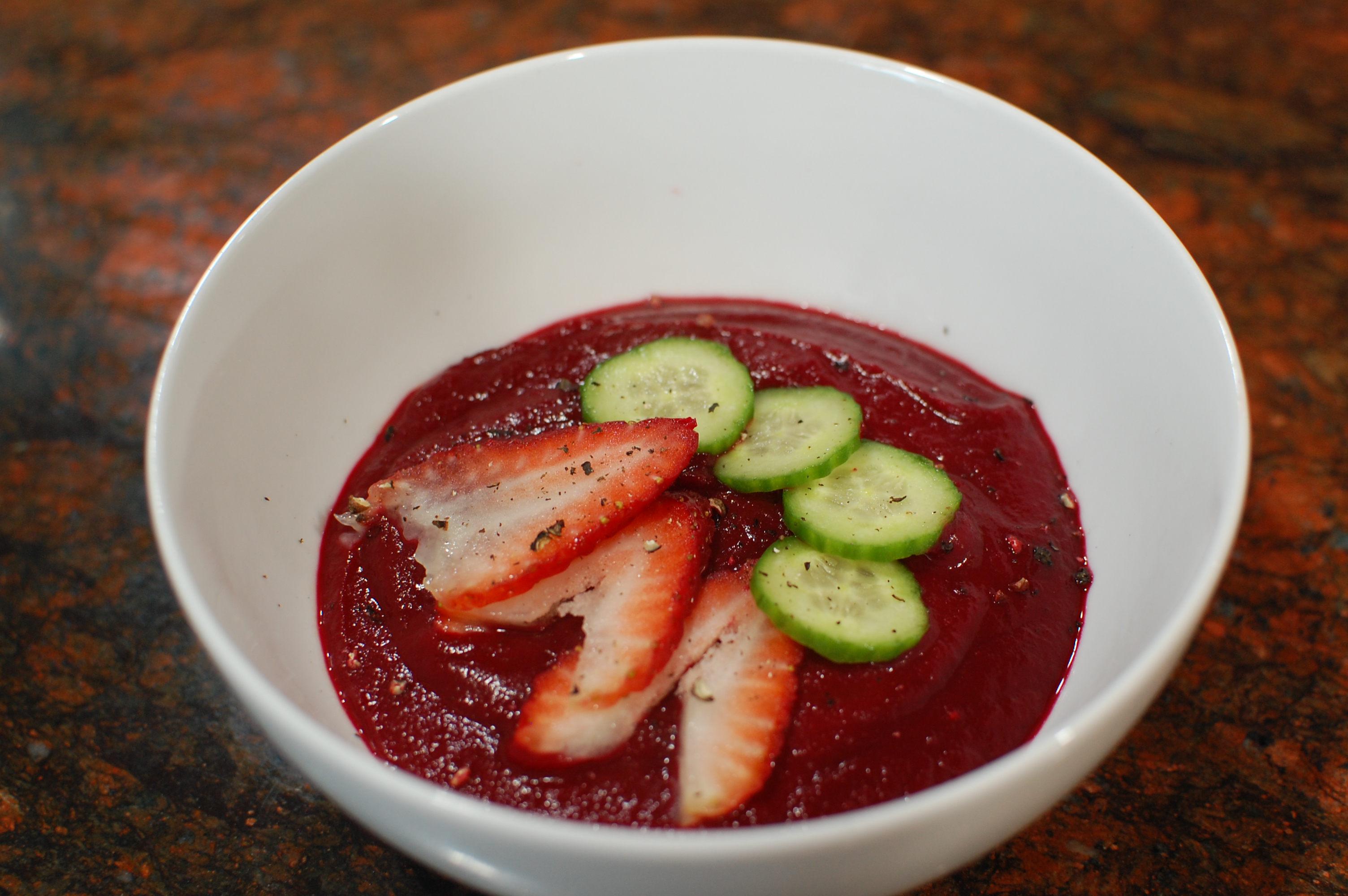 This week’s selection is from Dorie’s cookbook, Everyday Dorie. When this selection was chosen, I actually had beets and Persian cucumbers on hand. I wanted to try cold soup but it was a rainy day and my husband wanted hot soup. We love beets in our house usually with a salad and goat cheese. We have had various kinds of cold fruit or vegetable soup but never a beet soup. It sure looked pretty and the sliced strawberries and cucumbers were a welcome addition. I did not particularly like the soup hot, I would like to try again someday with the cold version. To see what others thought head over to Cook the Book Fridays.