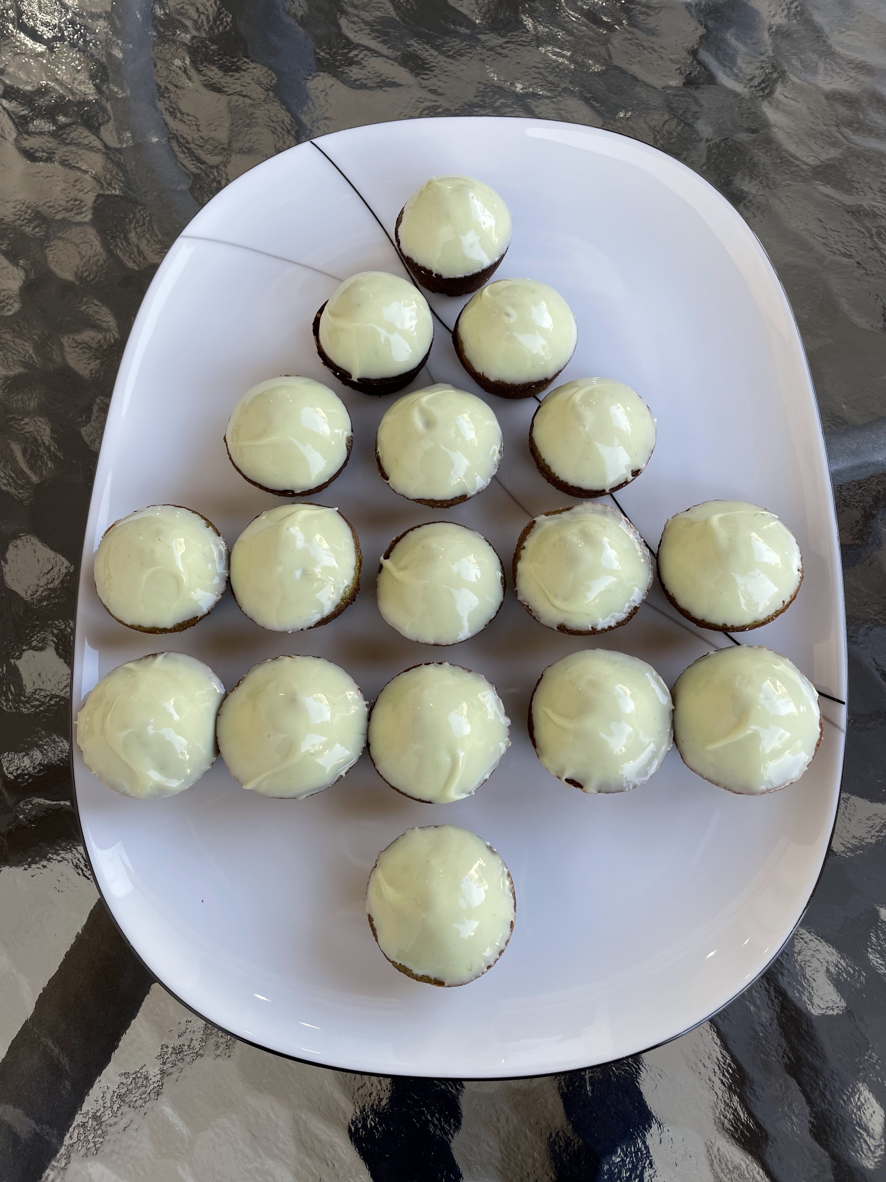 These bake up quick in 400 degree oven for 13 minutes. Let cool in the pan for 4 minutes then pop them out. You can serve these naked but I made the optional white chocolate glaze tinted with matcha powder. I made the full recipe of glaze which is 8-ounces of white chocolate and 4-ounces would have been enough, I had a lot left over. These shiny little cakes looked so festive that I was happy to share. I did not buy the freeze-dried raspberries as I had some old freeze-dried blueberries I planned on using but they got moist and could not be sprinkled.