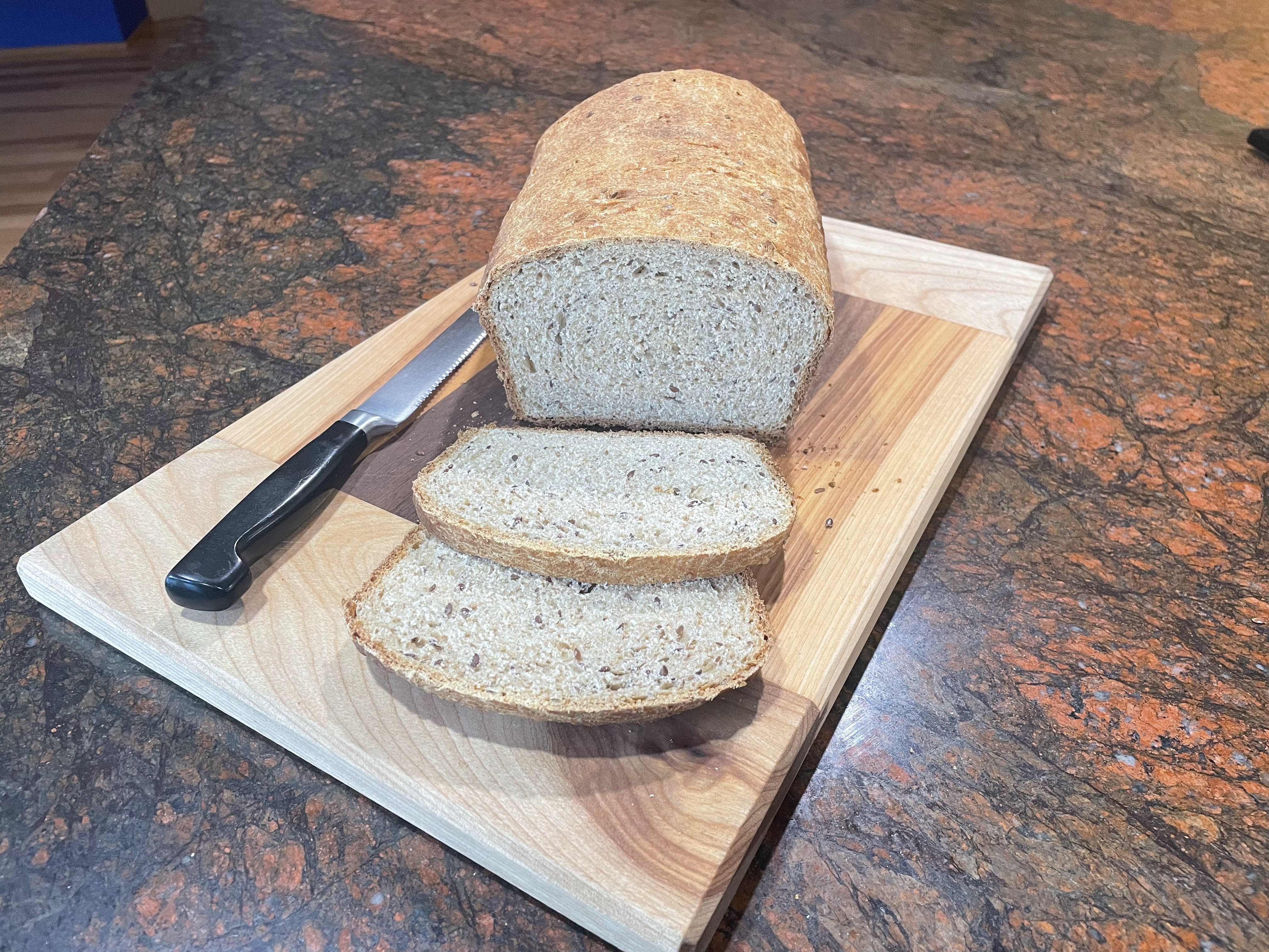 This bread was easy to make and baked up beautifully. It made great toast for breakfast. My husband commented that it needed more salt and I would agree. It has a little less salt than the white version so I made a note to add 1/4 teaspoon more next time.