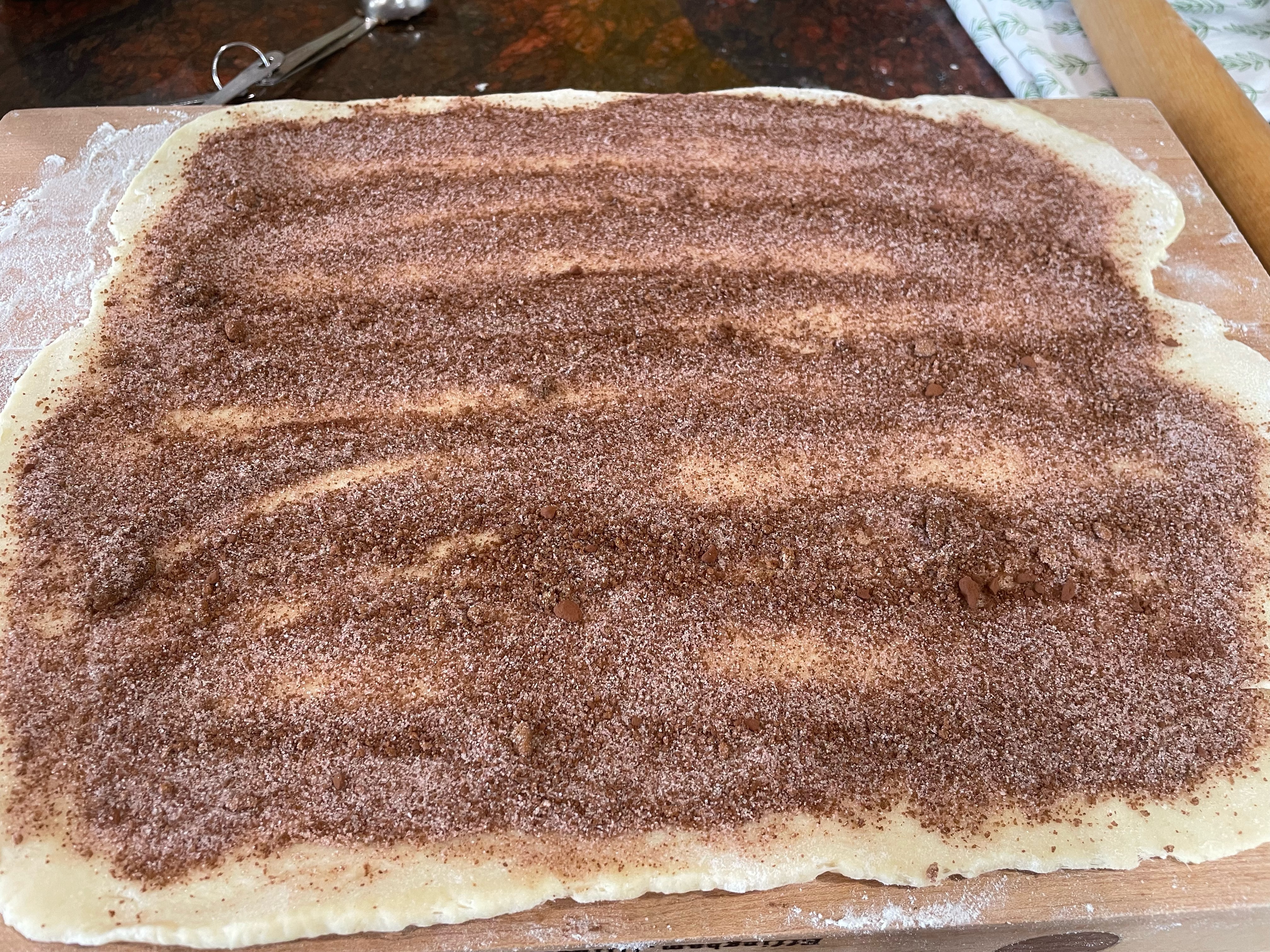 Once the dough is chilled, it is pretty straightforward on making the buns. Roll out to a rectangle, fill with the sugar/spice mixture, set in the caramel sauce and let rise for two hours. I am not an expert roller as my buns always come out in varying sizes. These buns baked up quite nicely though.